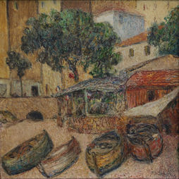 Un exemple "esquisse", "étude" et "tableau définitif" pour "À l'ombre des maisons (Villefranche), peinture sombre rue du poilu". 21 x 26 cm. 1922.